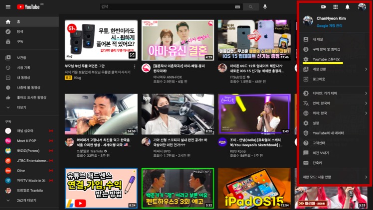 2. 아래 이미지의 노란 실선의 Youtube 스튜디오 메뉴를 클릭합니다.