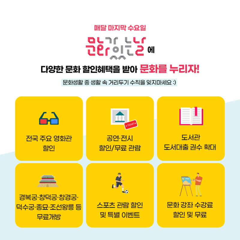 영화, 공연, 전시, 스포츠 등 다양한 문화 활동을 할인된 가격에 즐길 수 있도록 마련된 날입니다.