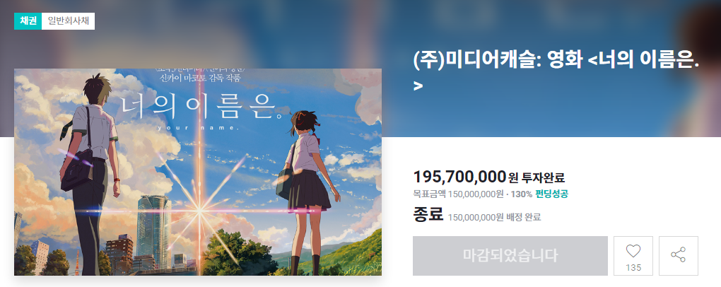 (주)미디어캐슬: 영화 <너의 이름은.> 프로젝트 투자자 모집