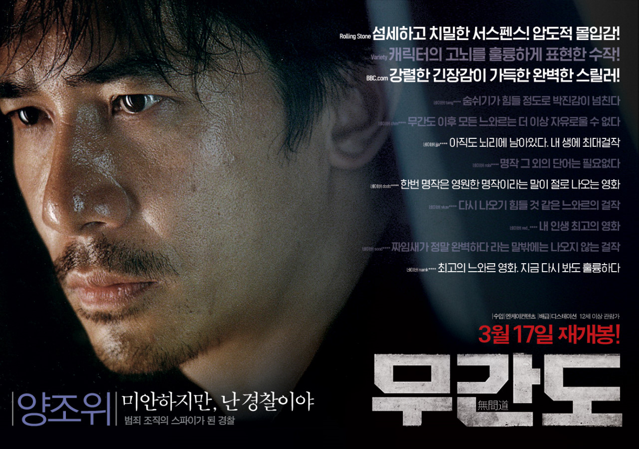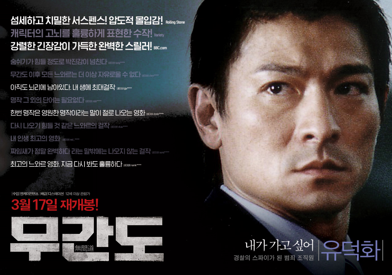 하지만, 몇몇 작품은 정말 지금 보아도 부족함이 없는 영화들이 있는데 이 영화 무간도가 그런 것 같습니다.