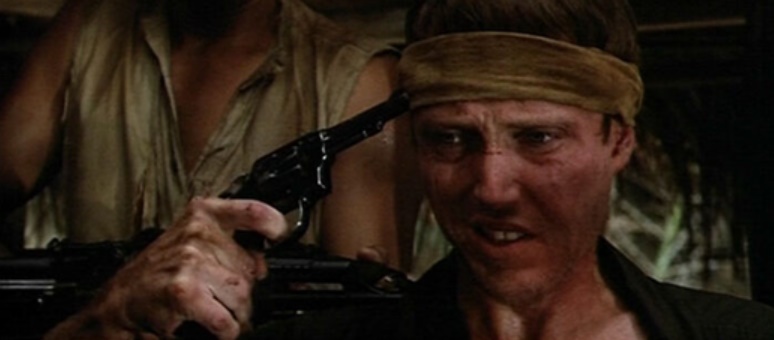 러시안 룰렛이란 리볼버 권총의 여러 개의 약실 중 하나에만 총알을 넣고 총알의 위치를 모른 채 한 사람이 먼저 총알로 머리를 관통당할 때까지 방아쇠를 당기는 죽음의 게임을 일컫는 용어입니다. 베트남 병사들이 뒤에서 총을 겨눈 채 닉은 자신의 머리에 대고 방아쇠를 당기고, 친구 마이클은 이를 두 눈을 감지 못한 채 그저 지켜봐야하는 게임을 강요받습니다.