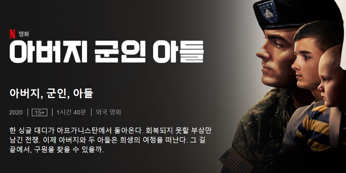 짧게 설명하자면 2020년 넷플릭스에서 제작한 다큐멘터리로 오랫동안 촬영을 하여 제작한 작품으로 아프가니스탄에 파병간 브라이언 아이쉬의 이야기입니다. 치명적인 부상을 당하고 돌아온 아이쉬. 전쟁은 아이쉬에게 많은 상처를 남겼지요. 두 아들에게 돌아온 아이쉬의 앞으로의 여정을 함께 해 보시기 바랍니다.