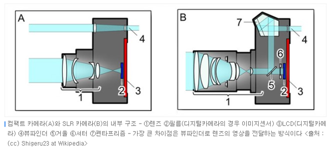 사실 똑딱이 카메라로 불리는 콤팩트 카메라의 시장은 스마트폰 카메라로 인해 사라졌다고 보셔도 됩니다. 요즘은 구경조차 못했으니까요. 아무튼 CCD나 CMOS의 이미지센서를 사용한다는 점은 같지만 다소 차이가 있는데 그것은 필름에 맺히는 영상과 뷰파인더를 통해서 보는 영상이 완전히 동일하지 않고 거리나 밝기에 차이가 나게 되어 촬영자가 원하는 사진을 찍지 못합니다. (아래 그림 참조)
